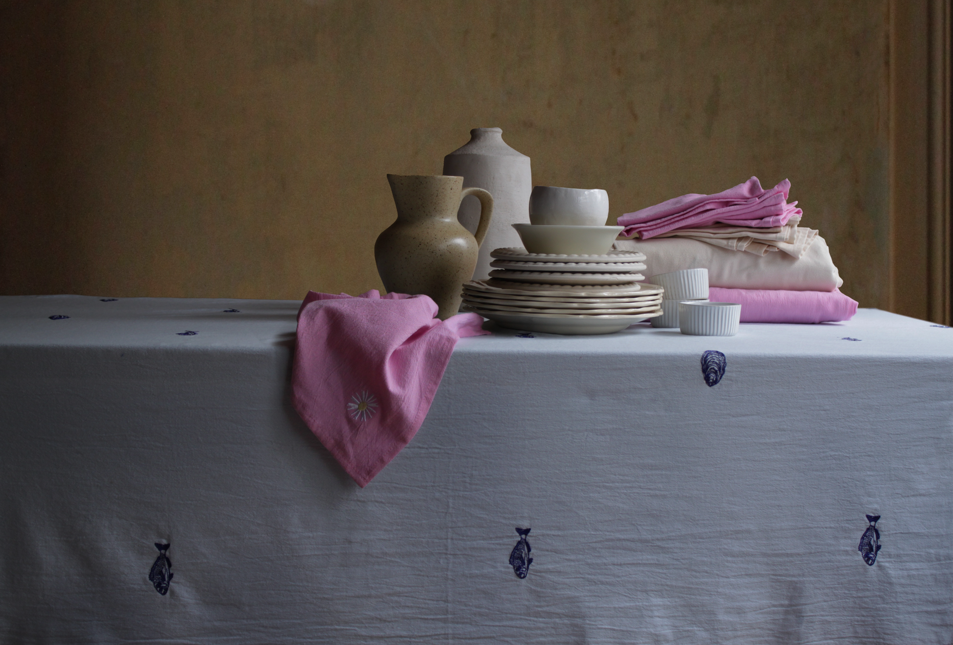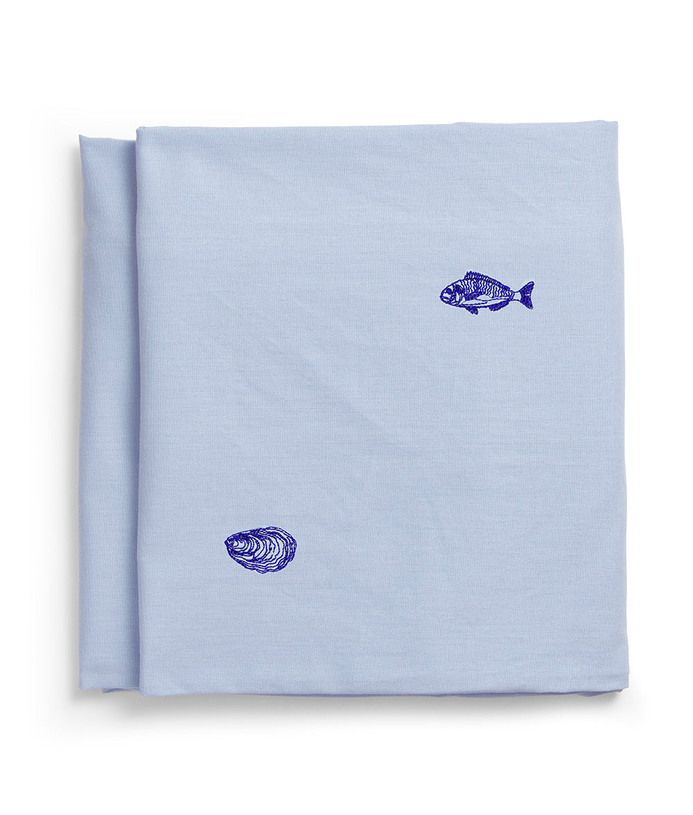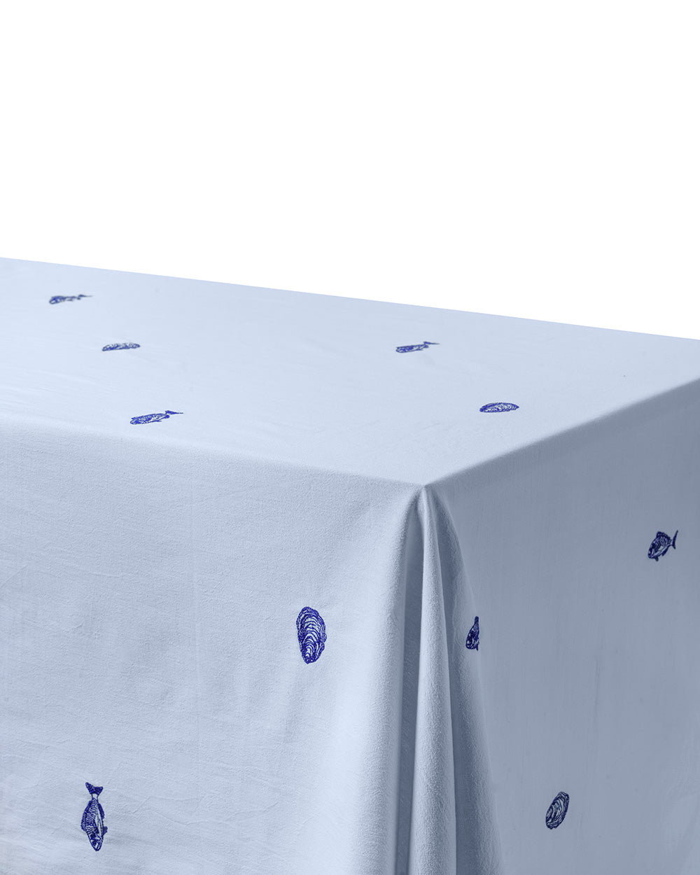 Den fantastiska bordsduken Josefin La Mer har en ljusblå bas med kobolt blå broderade ostron och fiskar.