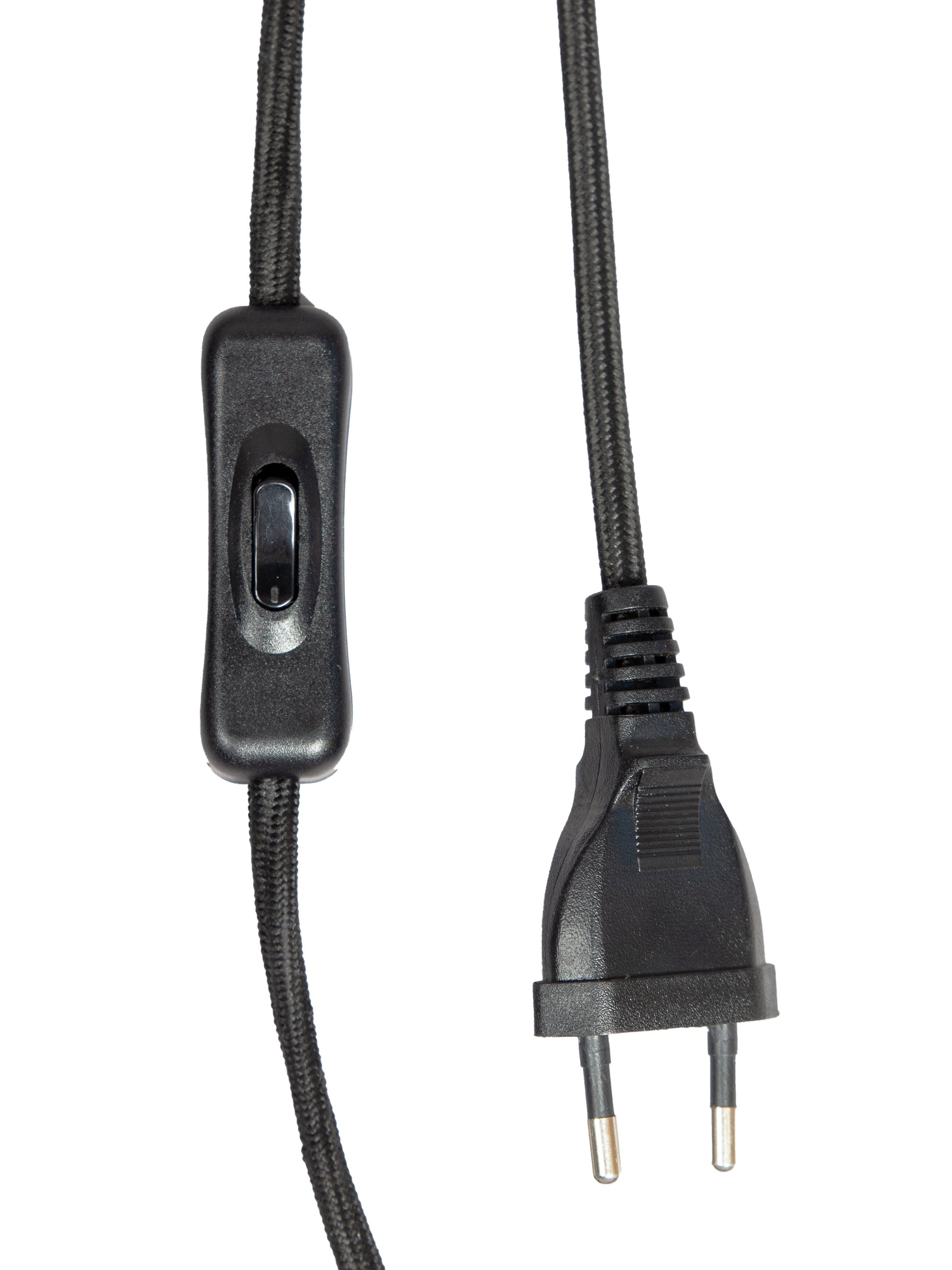 Svart sladd med strömbrytare och väggkontakt. E27 lamphållare. Lamphuvud är ledad för horisontell justering av lampskärmen. Max 40W. IP20.