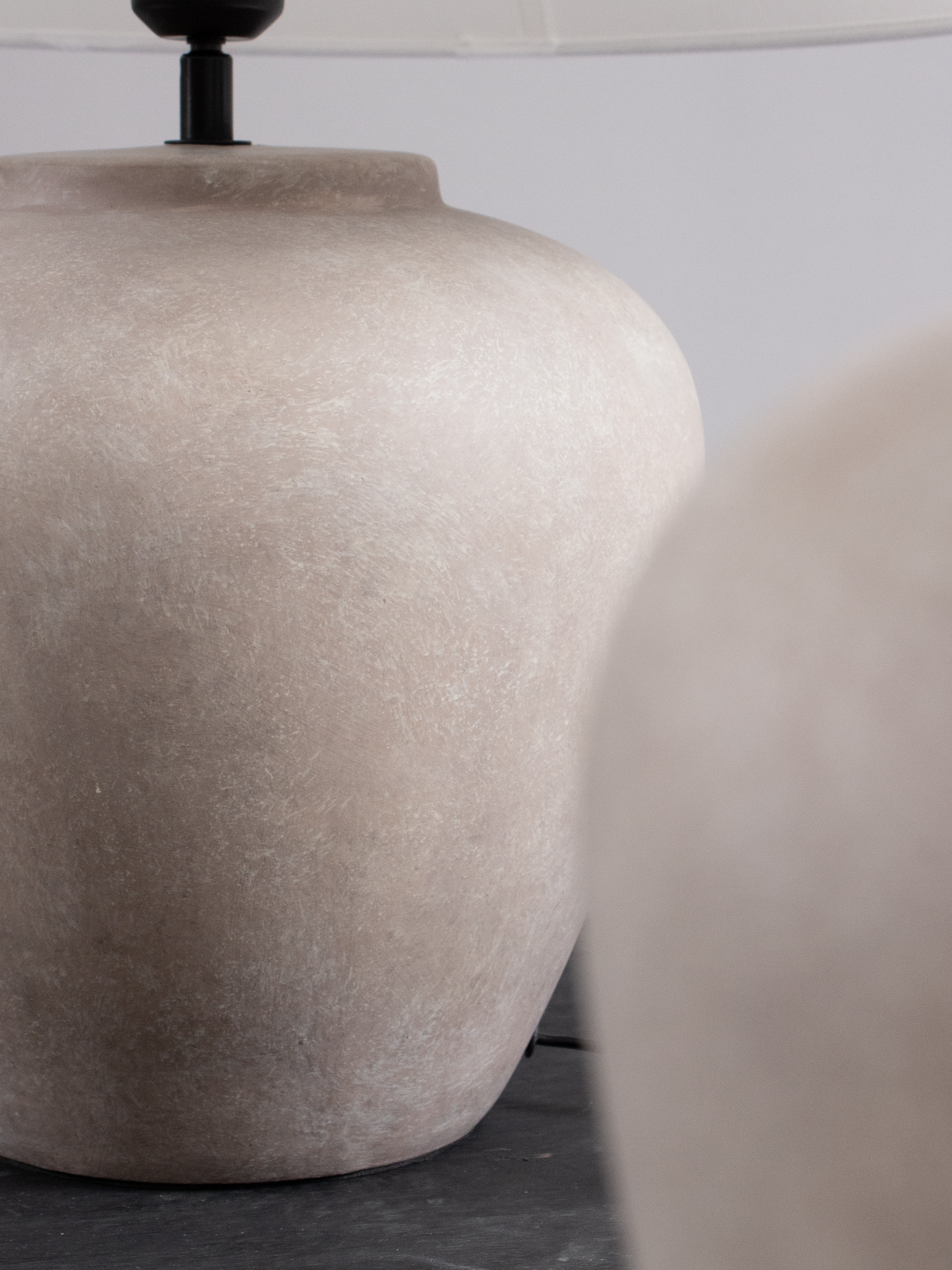 Lilly Lampfot i keramik. Lampfoten är handgjord och designad med en vacker urnform. Vintage finishen gör att varje lampa blir unik och gör att just din lampa kan avvika något från produktbilden. Lampan har en skärm i empirform med ett vackert linnetyg.