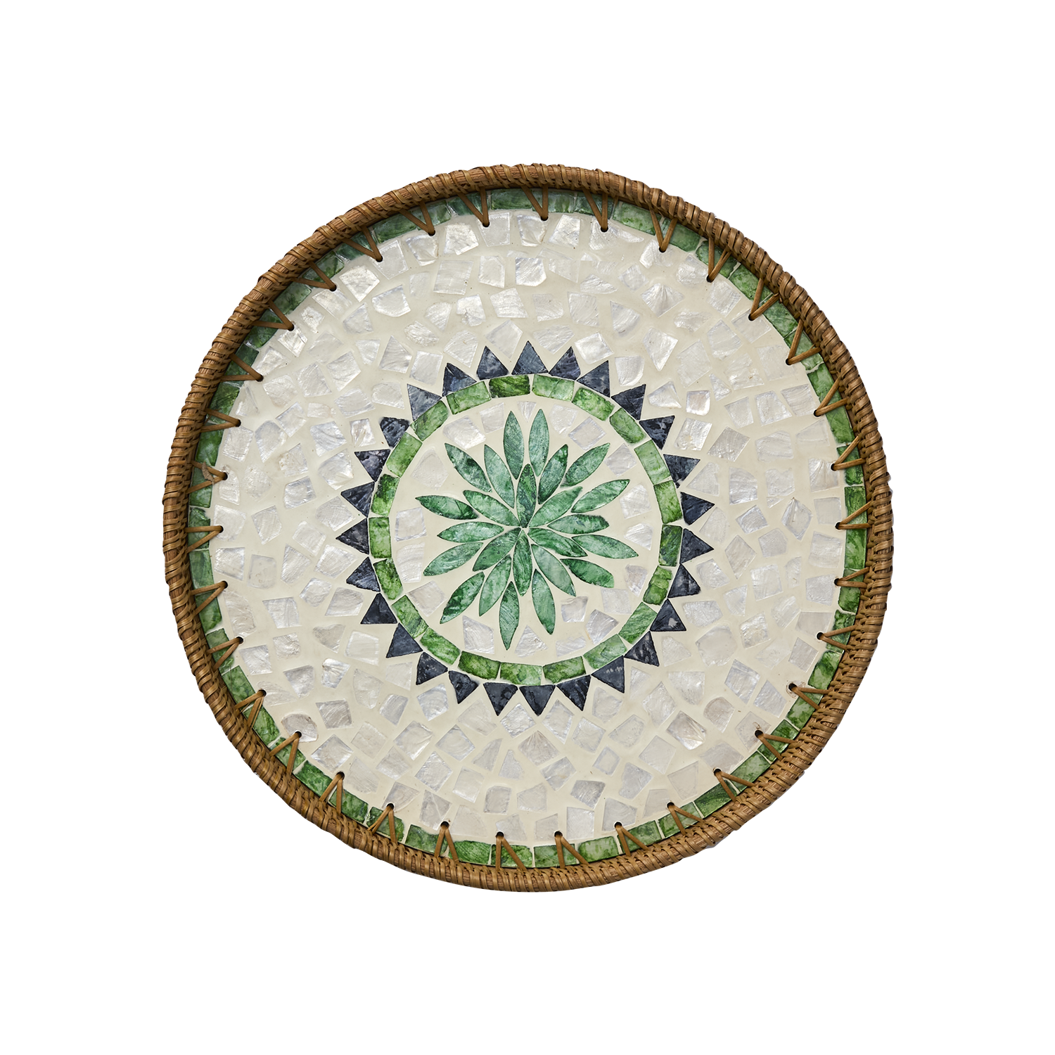 Den eleganta SUNNY brickan i grönt och natur är ett konstverk i sig. Mönstret på brickans yta är skapat av odlade snäckor, vilket ger en taktil och naturnära känsla. Kanten är i flätad rotting, vilket förstärker det rustika uttrycket. Använd den för att servera drycker, ordna en vacker fika eller som en stilfull detalj i inredningen. En handgjord och hållbar design som kombinerar funktion med estetik.