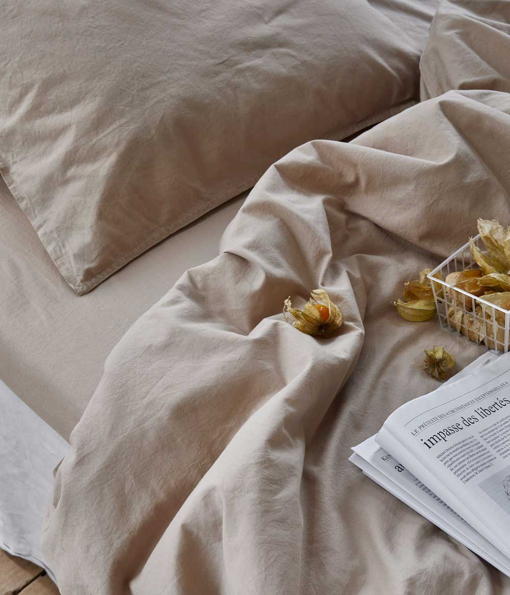 Lakanen är tillverkade i 100 procent ekologisk bomull och sydda i en stentvättad tuskaft som ger en mjuk och lite krispig känsla.