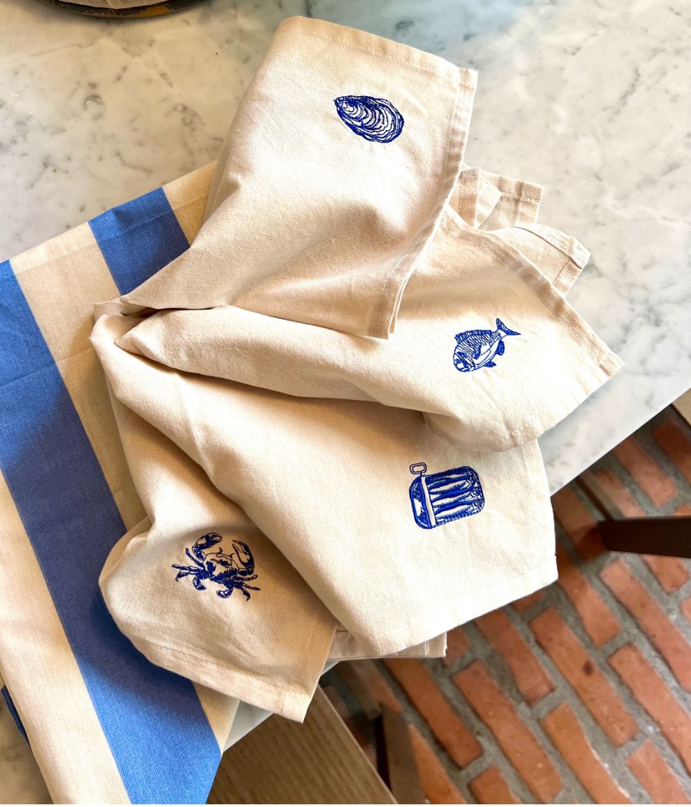 Dessa snygga servetter säljs i set om fyra. De har fyra individuella havsinspirerade broderier i koboltblått på Midnatts klassiska beige bas.. Broderierna inkluderar ett ostron, en krabba, en fisk och en burk med sardiner. Servetterna är 40×40 cm.