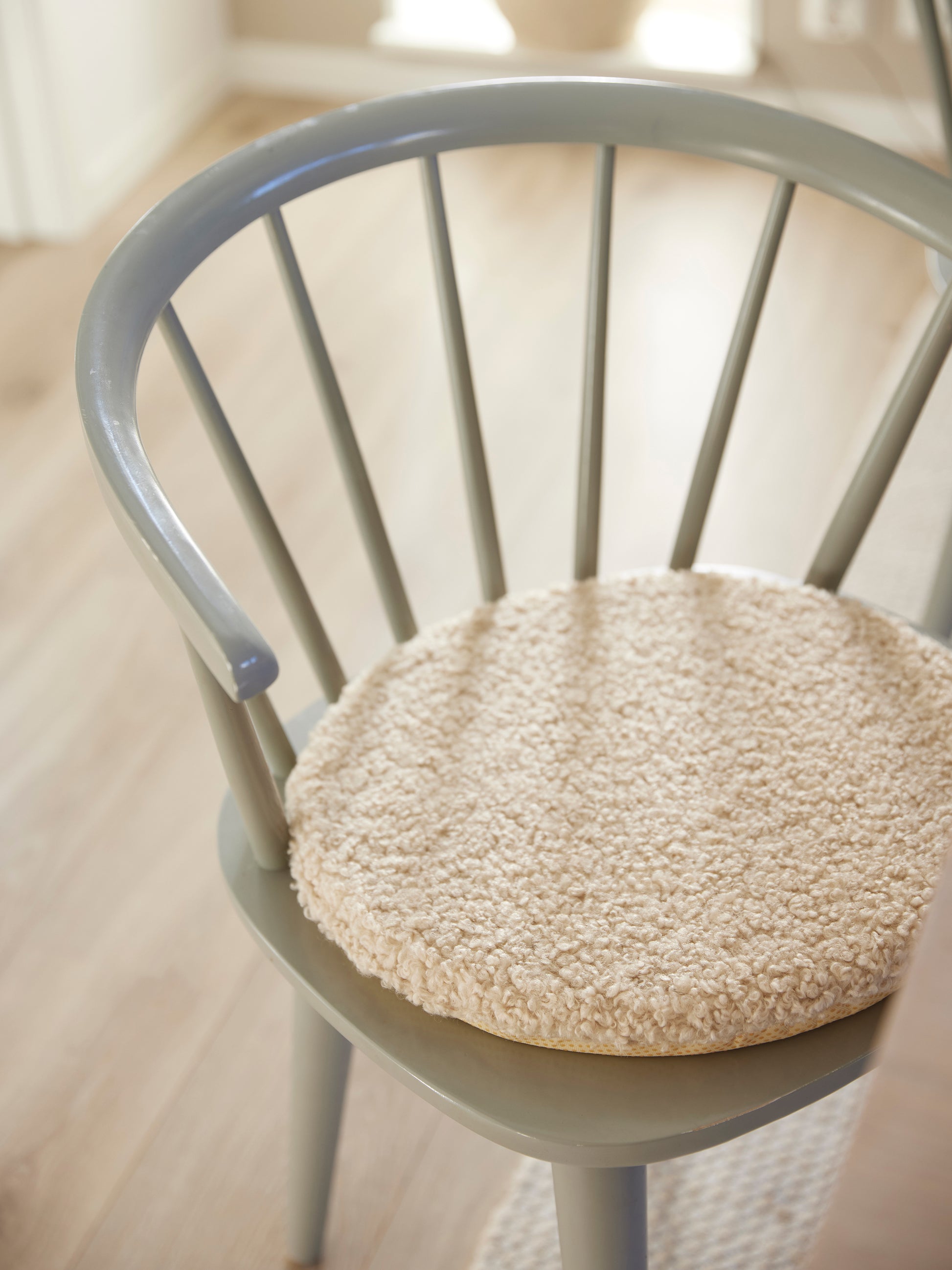 Rund stolsdyna i ullig fårskinsimitation på framsidan och mjukt tyg med halkskydd på baksidan. Dragkedja i sidsömmen. Dynan är 38 cm i diameter och har en 4 cm hög skumplatta som fyllning.