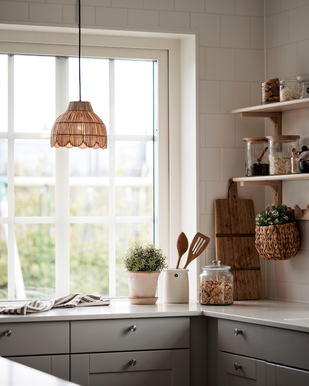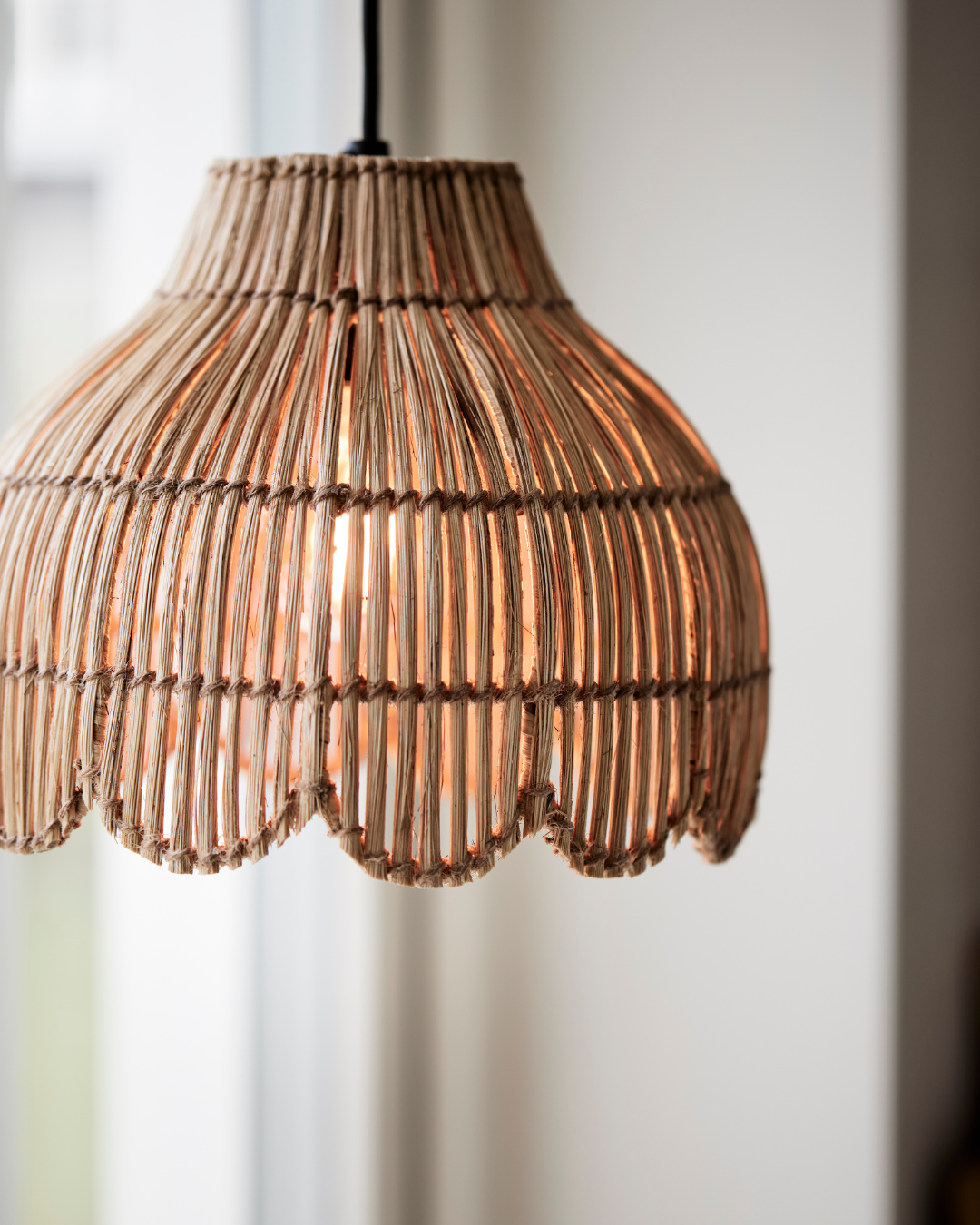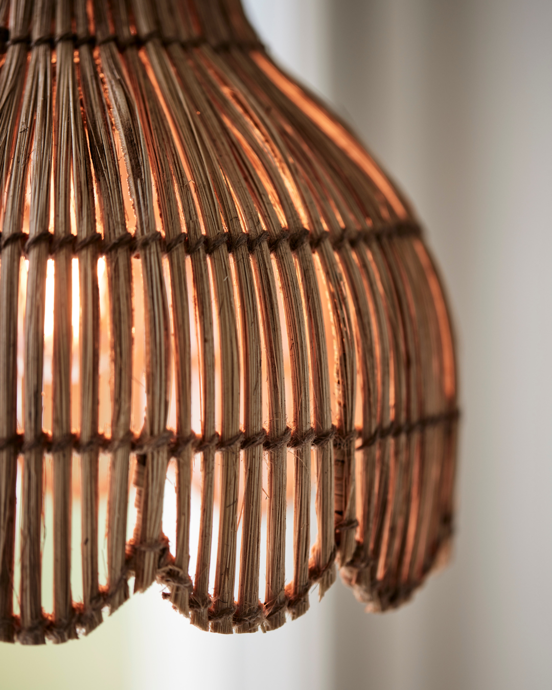Taklampa Pia är handgjord av naturmaterialet burifiber och jutetråd med en bågformad kant nedtill. Den unika designen låter ljuset silas och naturmaterialet ger en varm atmosfär. En mindre storlek som passar fint själv eller fler i rad. Levereras med svart takupphäng 1,2m för krokupphäng. Naturmaterialet kan skifta i färg, varje skärm är handgjord och det kan förekomma mindre storleksavvikelser.